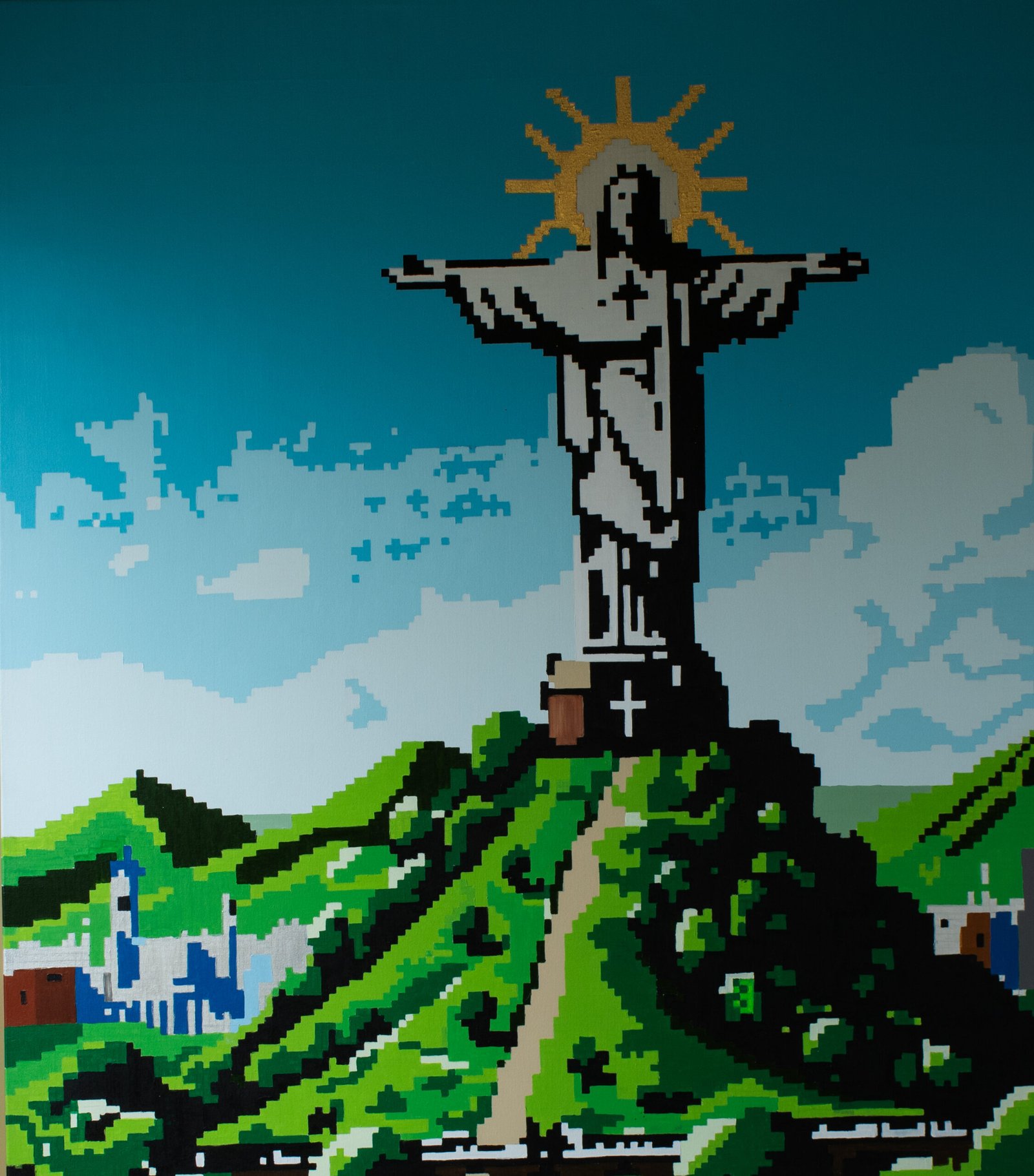 By translating this well-known landmark into a pixel grid, the painting connects local identity, cultural heritage, and modern artistic expression.
