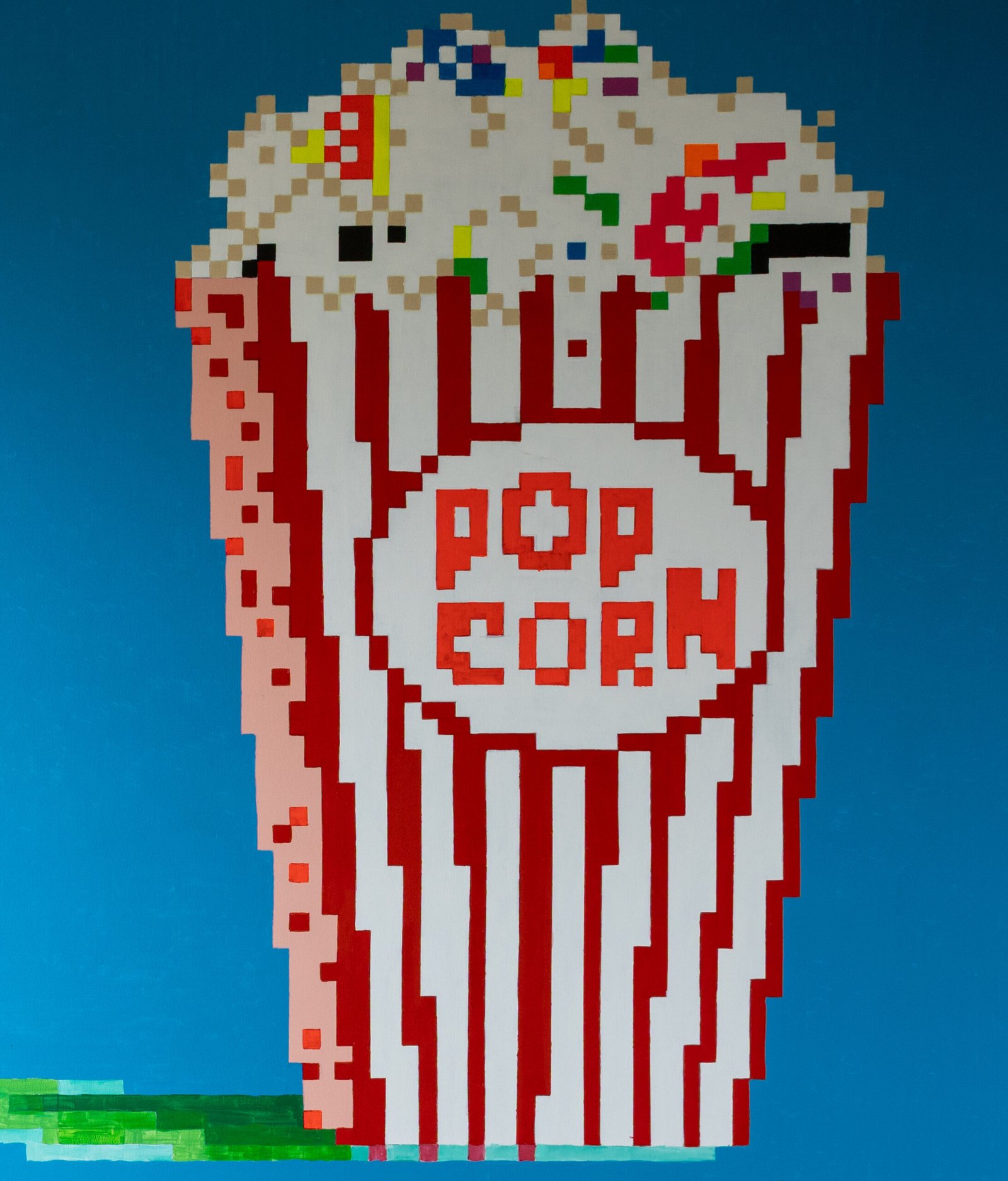 In this work, the familiar image of a popcorn container becomes a playful exploration of contemporary culture and visual language. By translating an everyday object into a structured pixel grid, the painting highlights how modern imagery is often experienced through digital screens and simplified visual forms.